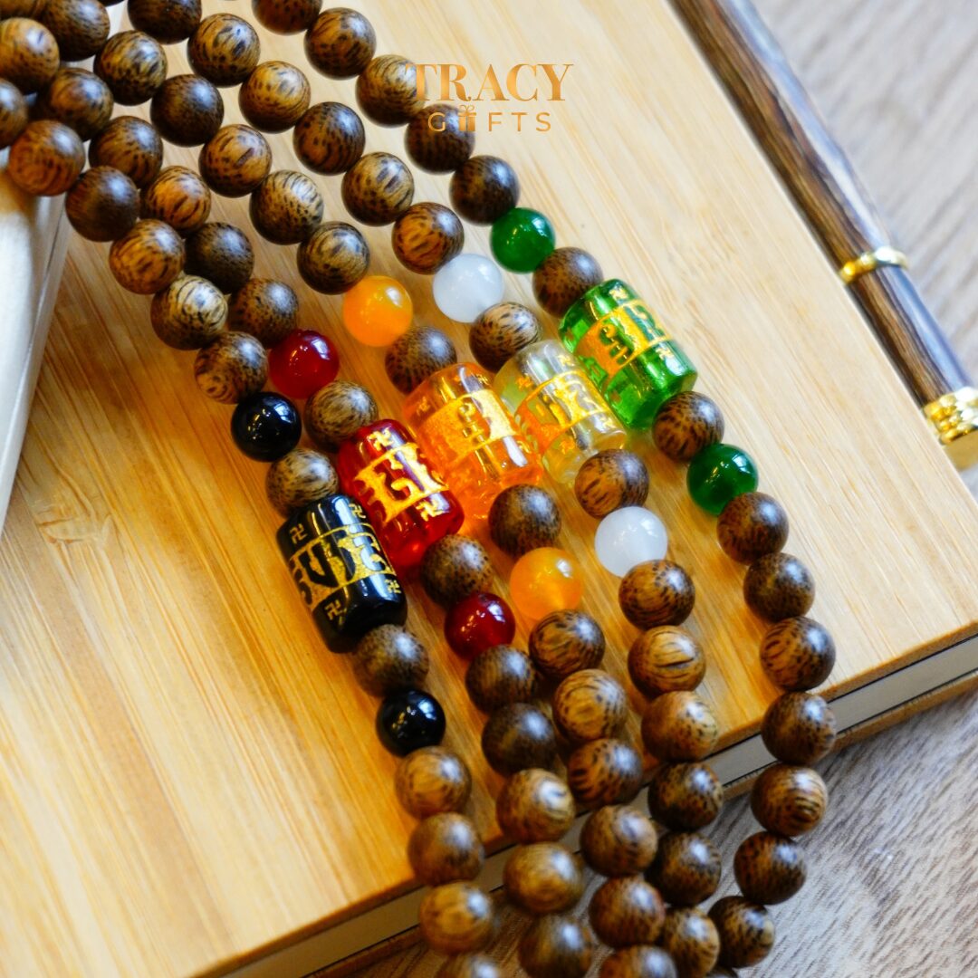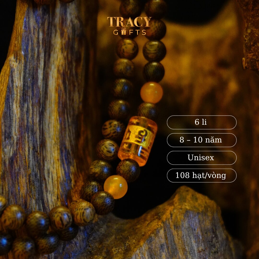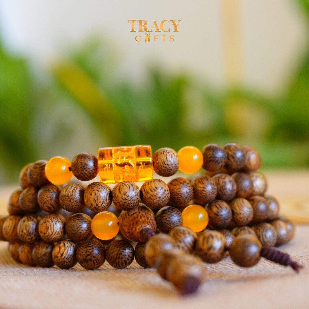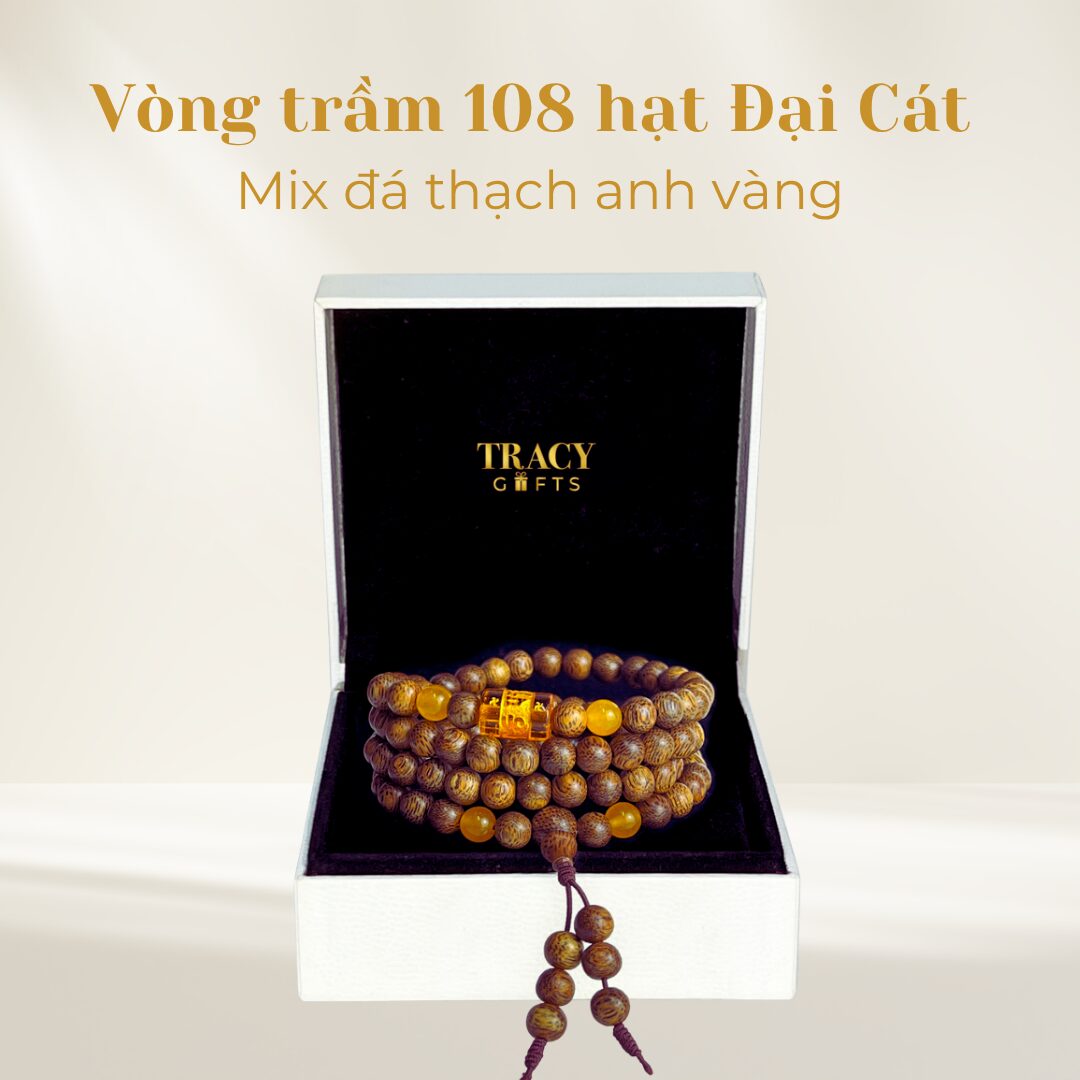 - Vòng tay Trầm Hương 108 hạt Đại Cát mix charm đá thạch anh màu vàng, được đựng trong hộp bảo quản cao cấp Tracy Gifts với thiết kế sang trọng.